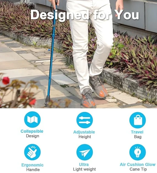 פאָלדאַבלע טעלאַסקאָפּיק גיין שטעקן, דער שפּיץ לייץ זיך בייַ נאַכט, וואָס זייער ינשורז די זיכערקייַט פון נאַכט גיין. (מיט ויסשטעלן אין ליכט פֿאַר זיכער צייט, די שייַנען שישקע קומט צו וויזאַביליטי אין פינצטערניש.