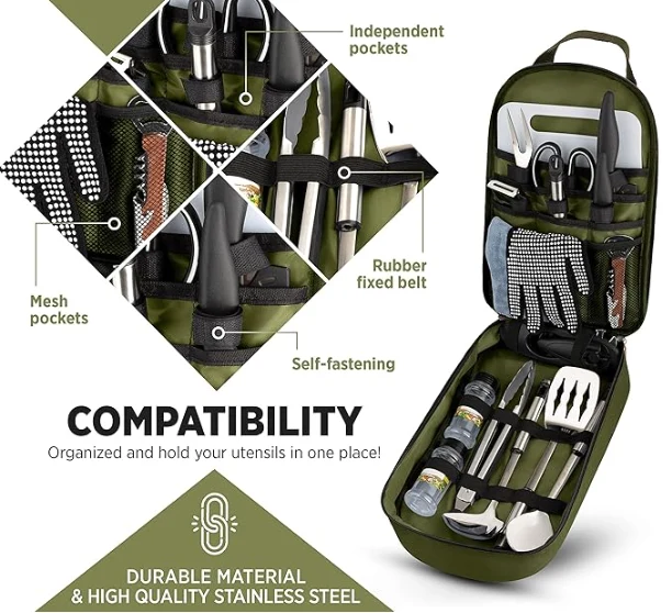 פּאָרטאַטיוו דרויסנדיק קעמפּינג געצייַג זעקל, יעדער יוטענסיל האט זייַן אייגן דעזיגנייטיד טאַש, אַזוי וניץ טאָן ניט באַקומען סמירד, סקראַטשט אָדער דאַמידזשד אין סטאָרידזש אָדער אין דורכפאָר. גיט גרינג אַקסעס צו דיין קיילים און עס איז יקוויפּט מיט אַ זיכער זיפּ פּלאָמבע