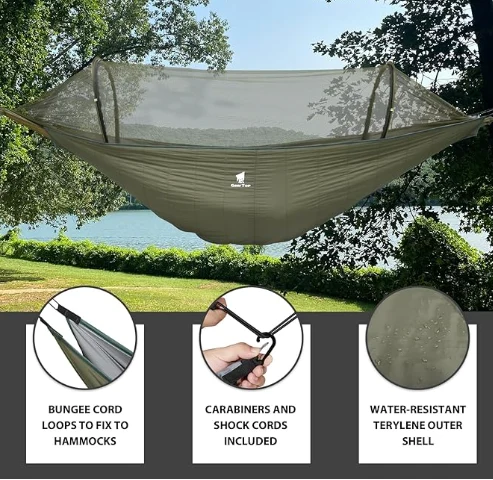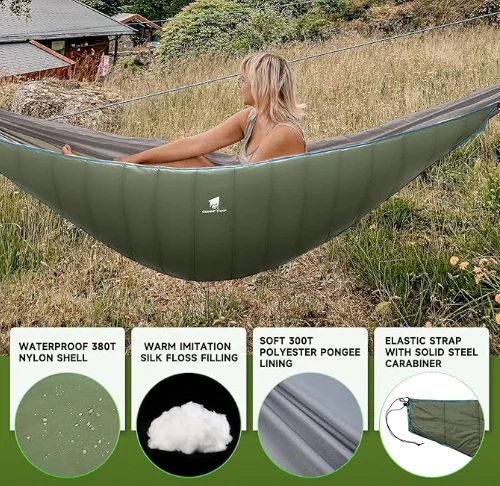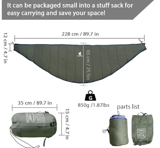 רייזע קעמפּינג כאַמאַק, פאַרבינדן די טריינינג פון אַ סליפּינג זעקל און די ינסאַלייטינג פון אַ כאַמאַק, מאַכן עס גרינגער צו פּאַסיק מיט קיין נאָרמאַל גרייס כאַמאַק, און האַלטן איר וואַרעם אין קאַלט וועטער. עס איז גאנץ פֿאַר קעמפּינג, באַקקפּאַקקינג, גייעג, דרויסנדיק אַקטיוויטעטן, מאַונטינירינג